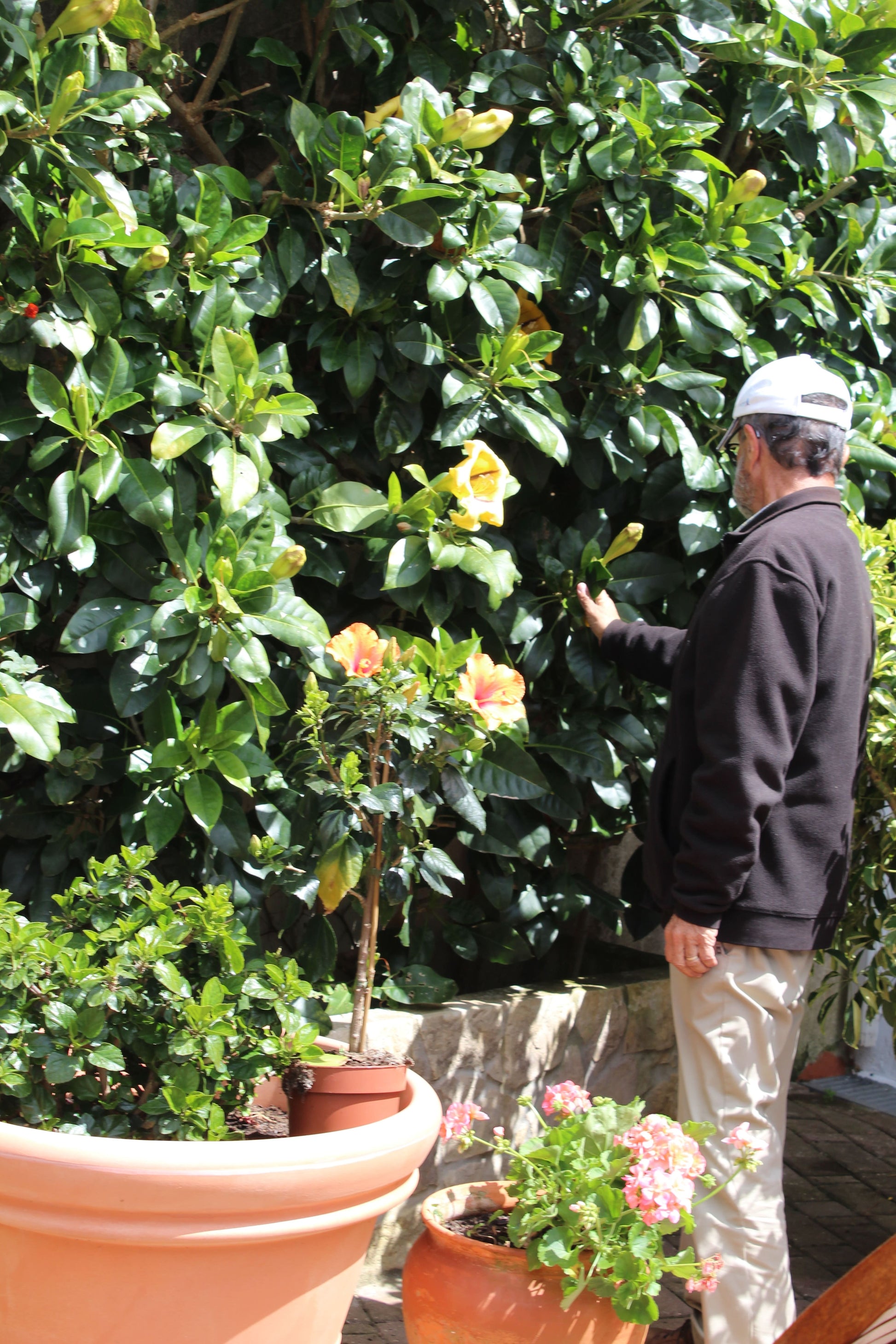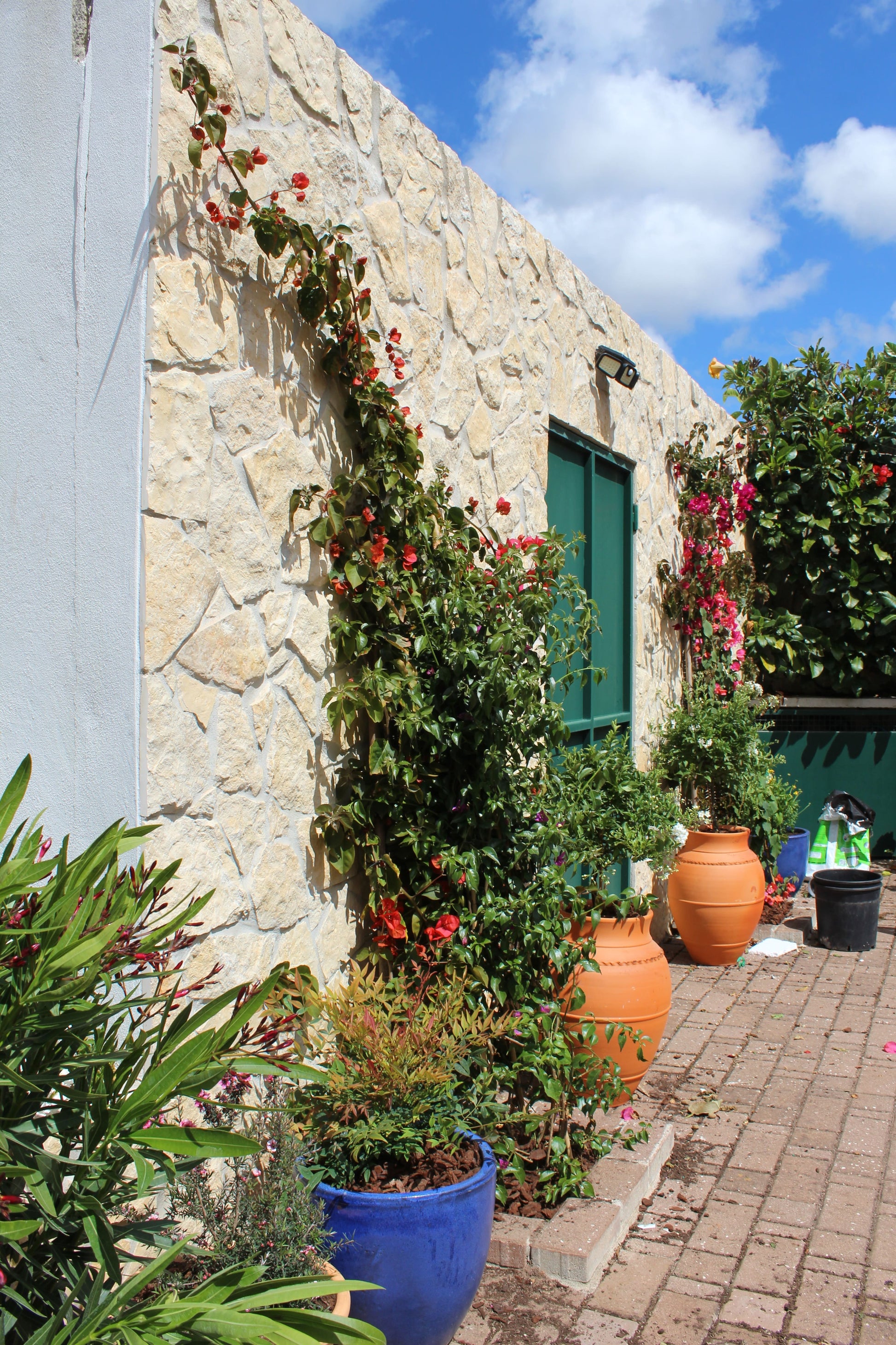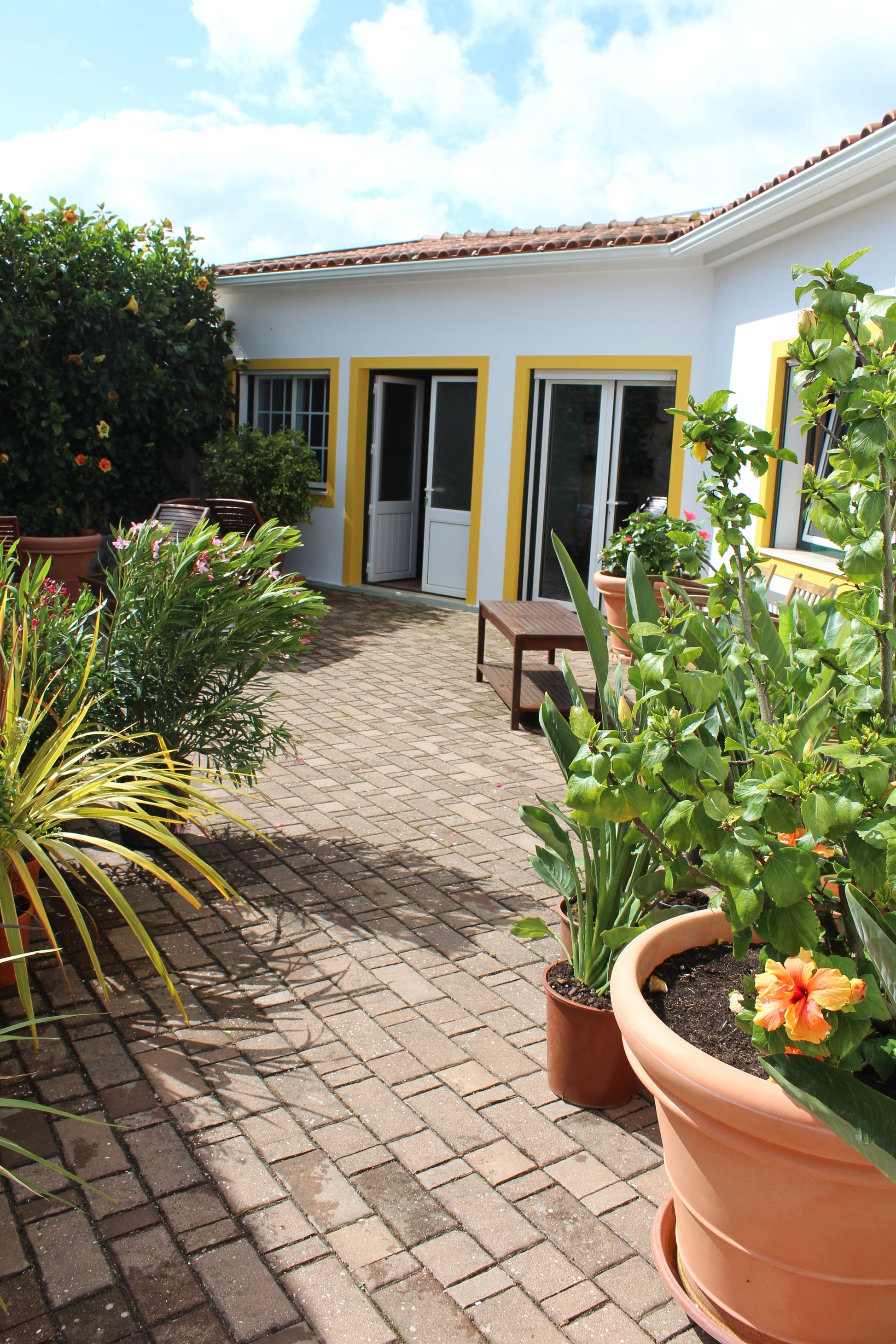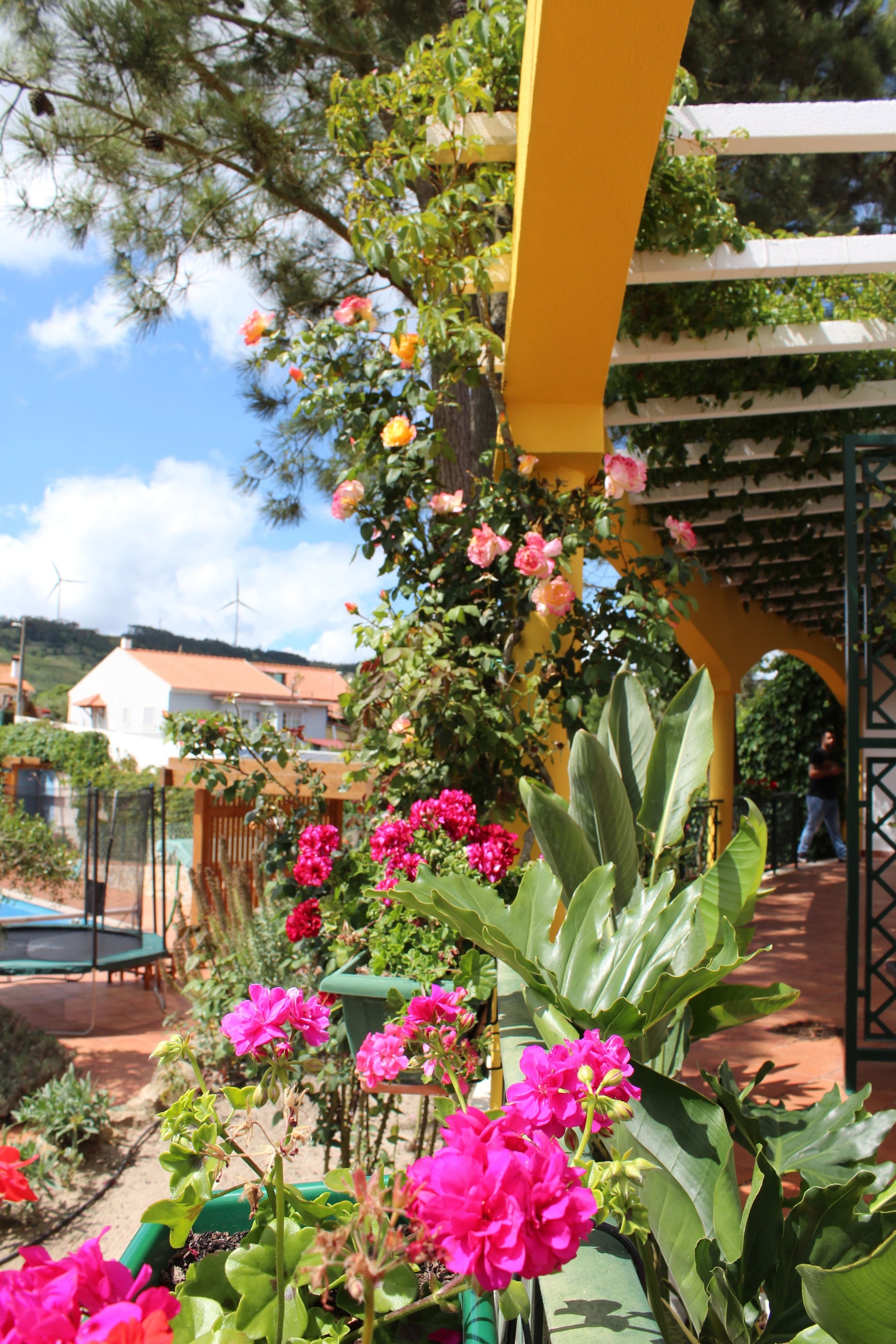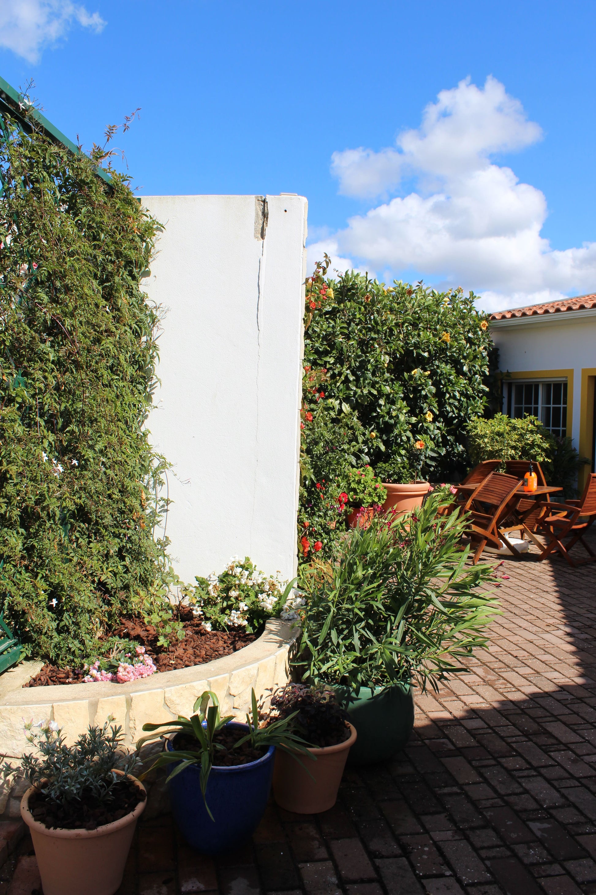 No pátio das traseiras, com vista para o corredor de roseiras já existente, criámos um jardim de cores e flores. Algumas espécies utilizadas foram: trachelospermum jasminoide, veronica, irsina, dimorphotecas.