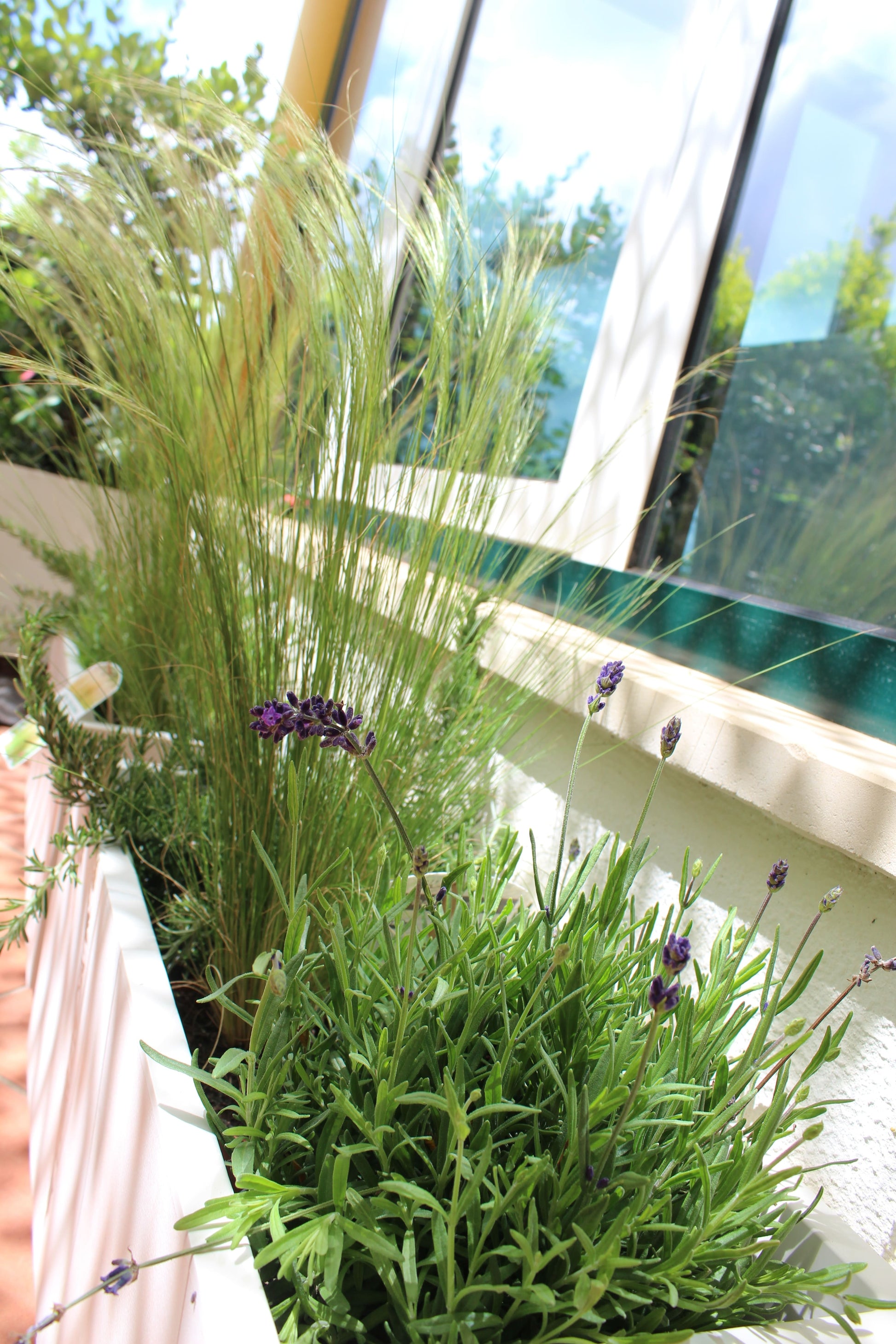 → A sebe base foi metrosideros excelsus fazendo match com o azul esverdeado das oliveiras. Na base colocámos plantas hortícolas e outras ornamentais, entre elas alecrim (rosmarinus oficinalis), stipa e dimorphotecas.