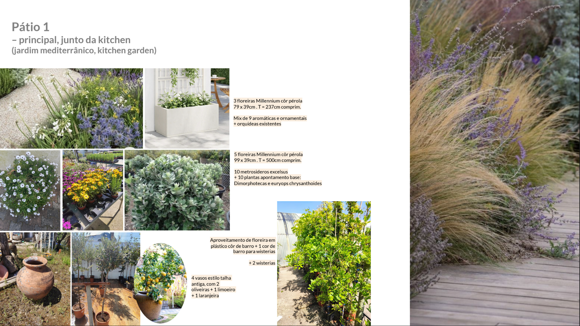 No pátio principal, junto da cozinha, definimos o estilo kitchen garden e jardim mediterrânico.
